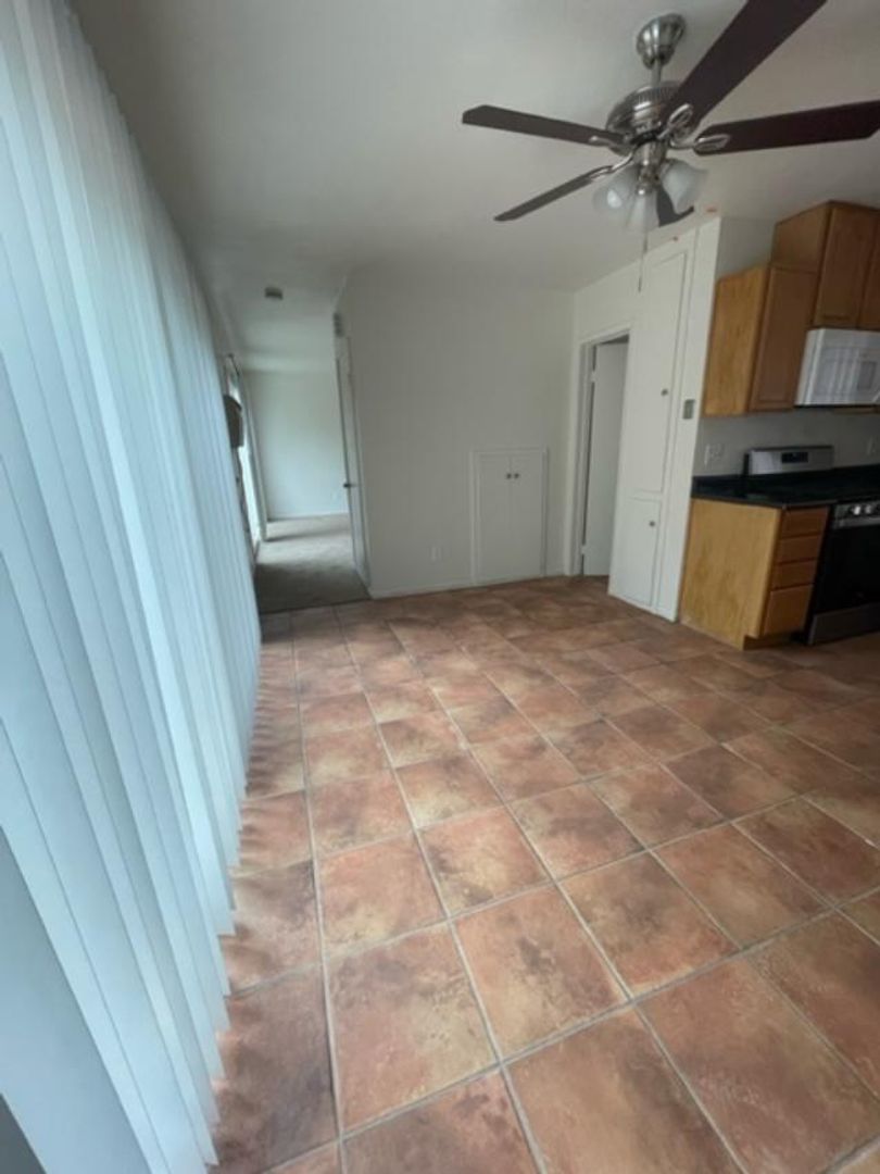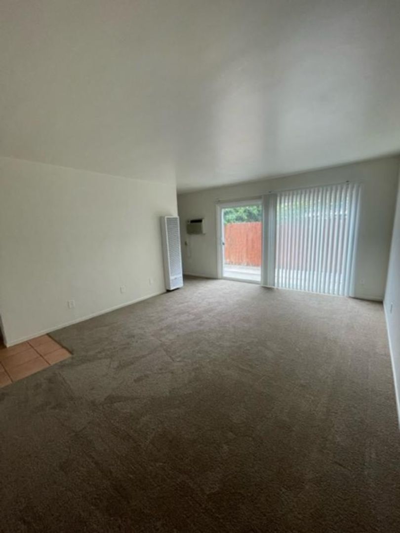 This apartment has new carpet, blinds, sliding glass doors in both living room and dinging room, vanity in 1/2 bath, garbage disposal, appliances and new paint. The kitchen comes with a gas stove, refrigerator, dishwasher, garbage disposal, and microwave. Small dining area just off kitchen. There is carpet and tile flooring, every room has a wall or window ac, there is wall heating. 2-sliding glass doors one off living room and one off dining room both open to the patio area. Complex has coin laundry and gardening service for common areas.