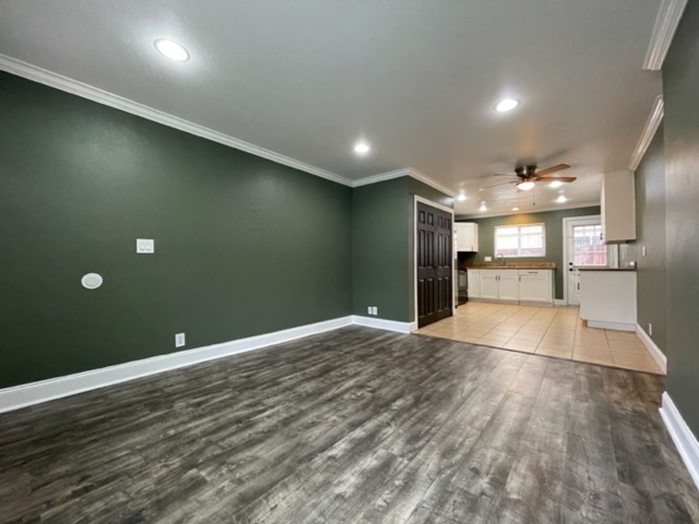 This unit has luxury vinyl plank and tile flooring. The kitchen comes with and electric stove, stainless steel refrigerator, built in microwave, and garbage disposal. Small dining area.