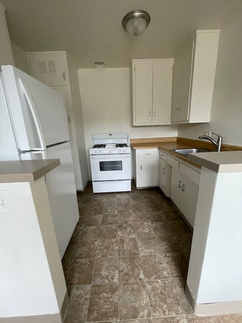 This unit has carpet and vinyl flooring. The kitchen comes with a gas stove, and refrigerator. Small dining area just off the kitchen.