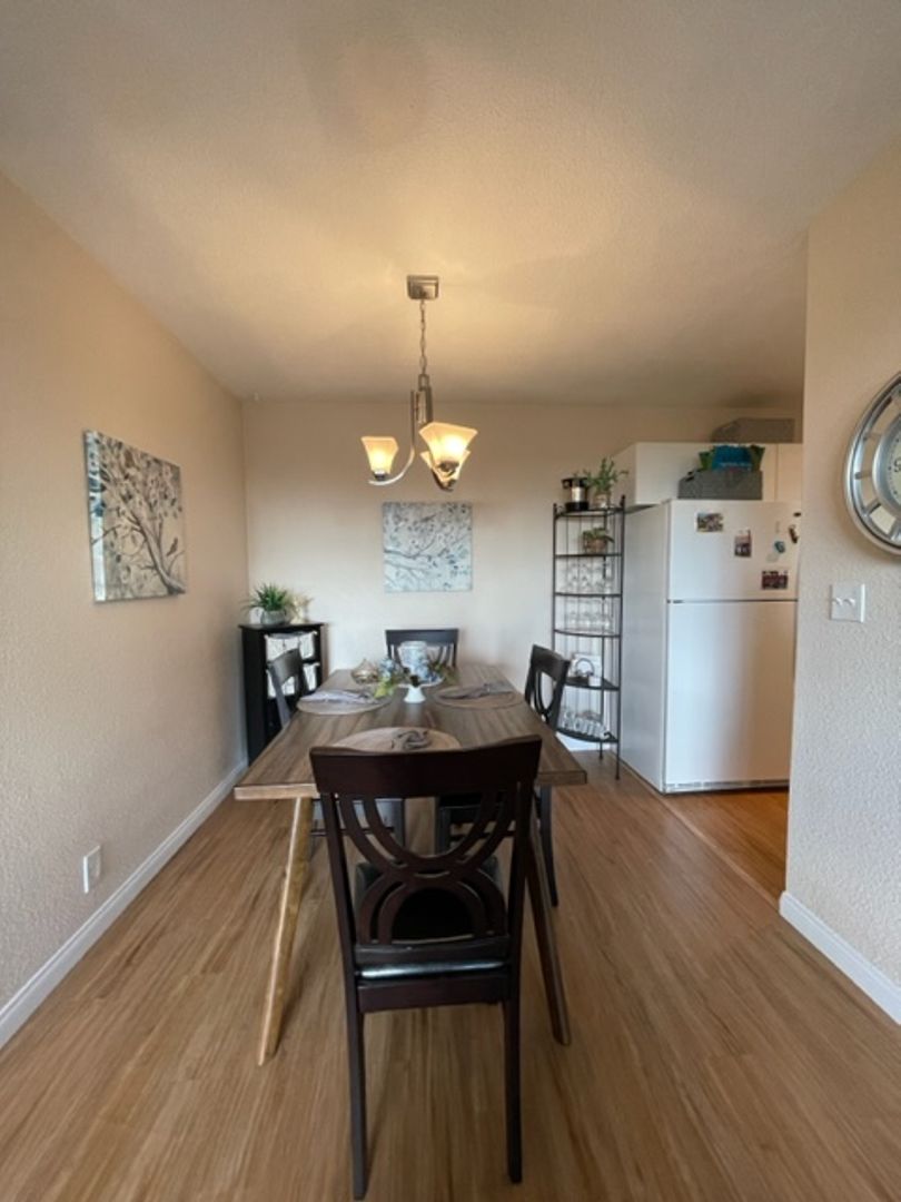 This unit has carpet and vinyl flooring, the kitchen comes with an electric stove, refrigerator, dishwasher, microwave and garbage disposal. Small dining area just off kitchen.